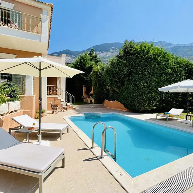 Η 1η βίλα “Villa Thelxis” (120m²) είναι χτισμένη στους πρόποδες του όρους Αίνος, μέσα σε έναν καταπράσινο ελαιώνα με πεύκα και κυπαρίσσια. Η ατμόσφαιρα είναι απόλυτα χαλαρωτική και φιλόξενη. Διαθέτει ιδιωτική πισίνα (7x5μ.), ξαπλώστρες, ομπρέλες, εξωτερικό καθιστικό, τραπέζι πινγκ πονγκ και BBQ, προσφέροντας μια μοναδική εμπειρία διακοπών.