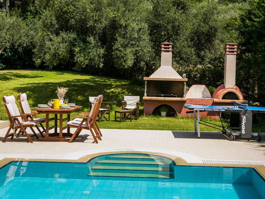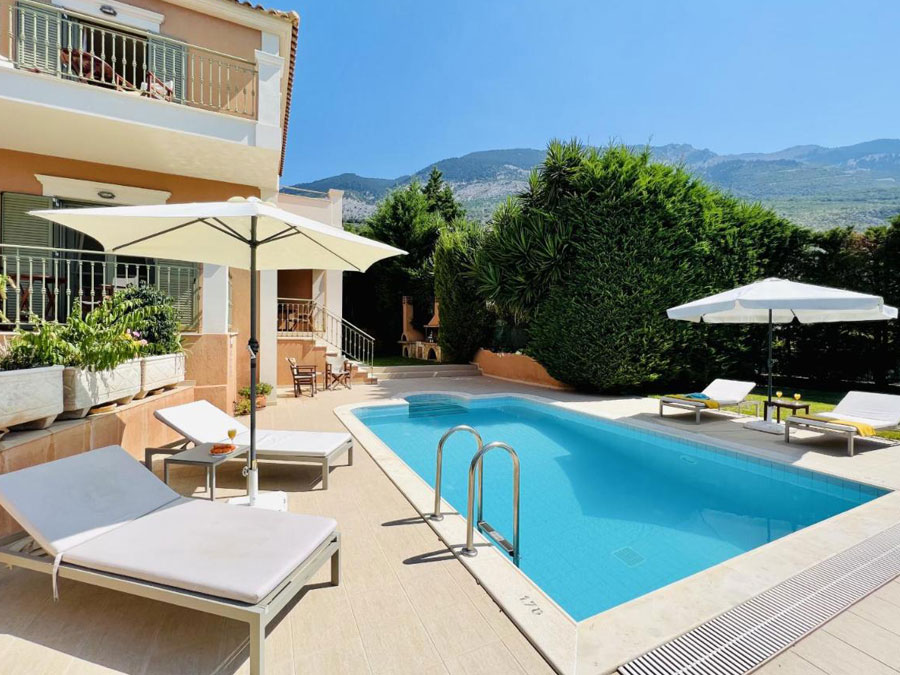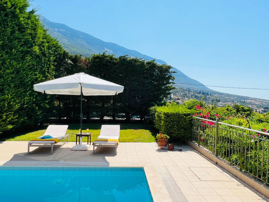 Η 1η βίλα “Villa Thelxis” (120m²) είναι χτισμένη στους πρόποδες του όρους Αίνος, μέσα σε έναν καταπράσινο ελαιώνα με πεύκα και κυπαρίσσια. Η ατμόσφαιρα είναι απόλυτα χαλαρωτική και φιλόξενη. Διαθέτει ιδιωτική πισίνα (7x5μ.), ξαπλώστρες, ομπρέλες, εξωτερικό καθιστικό, τραπέζι πινγκ πονγκ και BBQ, προσφέροντας μια μοναδική εμπειρία διακοπών.